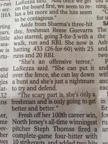With 2 more hits in today’s win Freshman Reese Guevarra breaks #1 in NJ and nationally ranked softball team IHA’s freshman hit record with 47 hits and more games left to play.